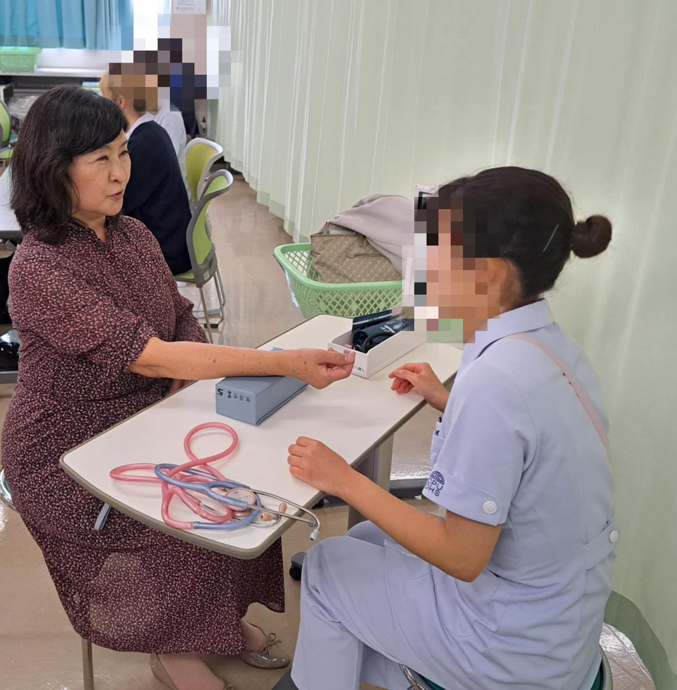 看護学科のブースでは、血圧測定やベッドメイキング体験、学生さんによる進路相談も行われていました。
