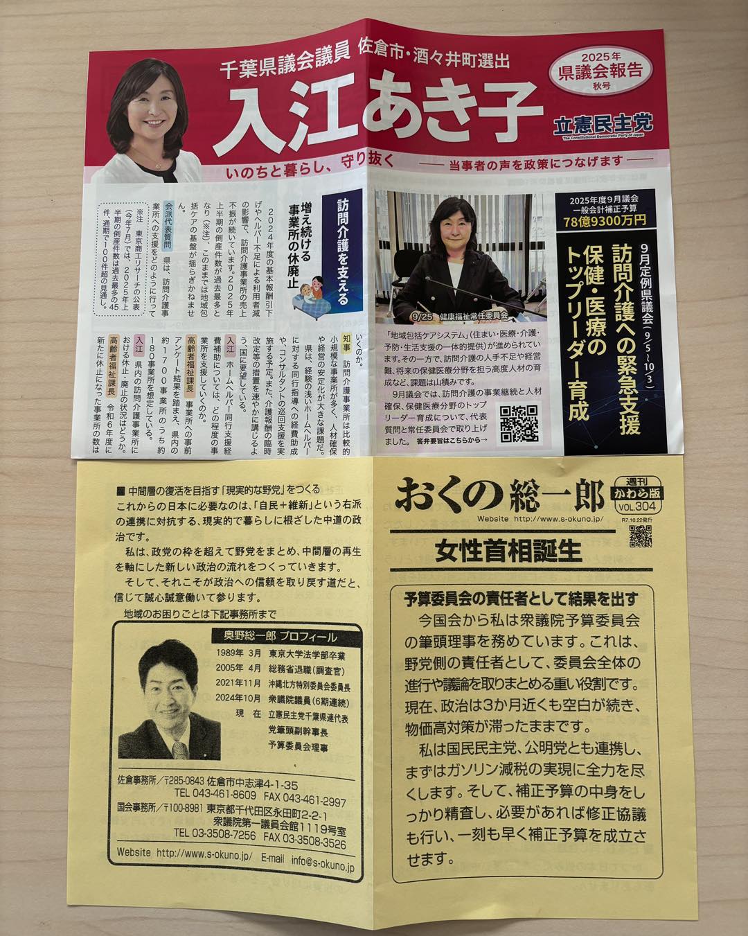 今朝は奥野総一郎衆議院議員と志津駅頭で国政・県政報告を配布。