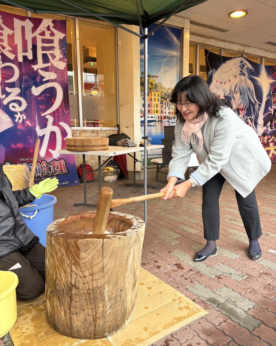 あいにくの小雨でしたが、商店会の皆さんや学生ボランティアの協力により、付きたてのお餅が用意されました。