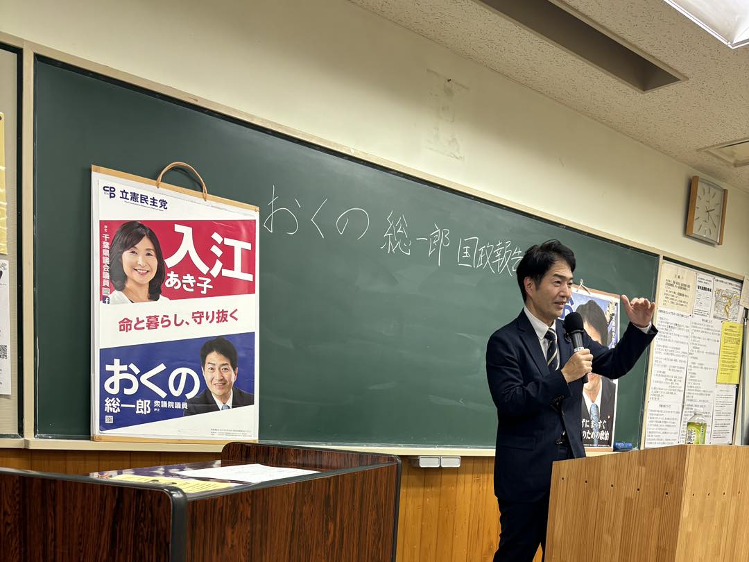 今日は、午後から佐倉市中央公民館で奥野総一郎衆議院議員の国政報告会が開かれました。