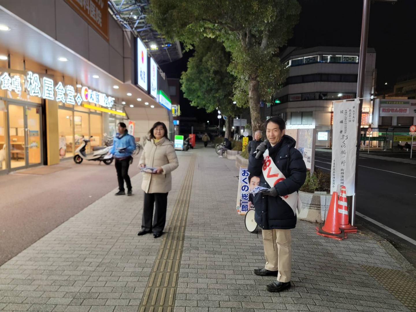 18時半頃、京成臼井駅で下車し、奥野総一郎衆議院議員候補の夕駅頭に合流。