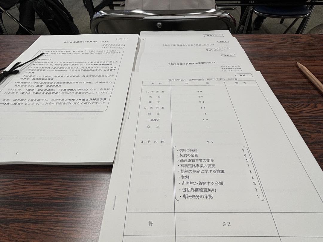 新年度の一般会計当初予算案2兆2534億8700万円や国の補正予算に対応した2月補正予算案154億8000万円をはじめ、地元印旛沼改良区の賦課金の按分変更など、多くの議案の概要説明を受けました。