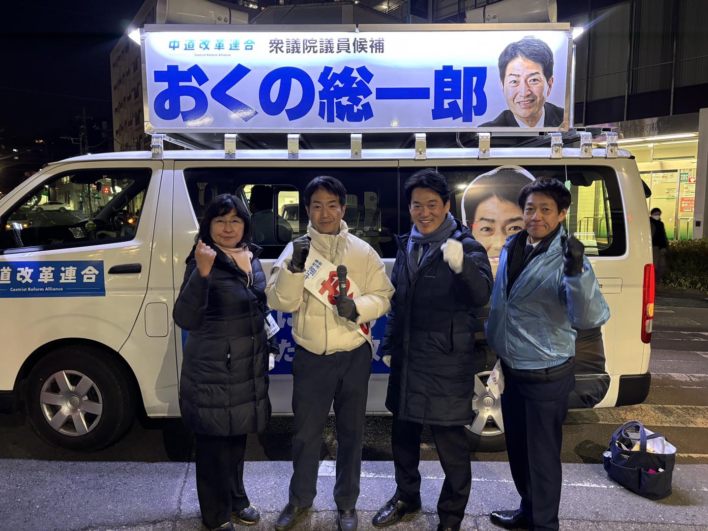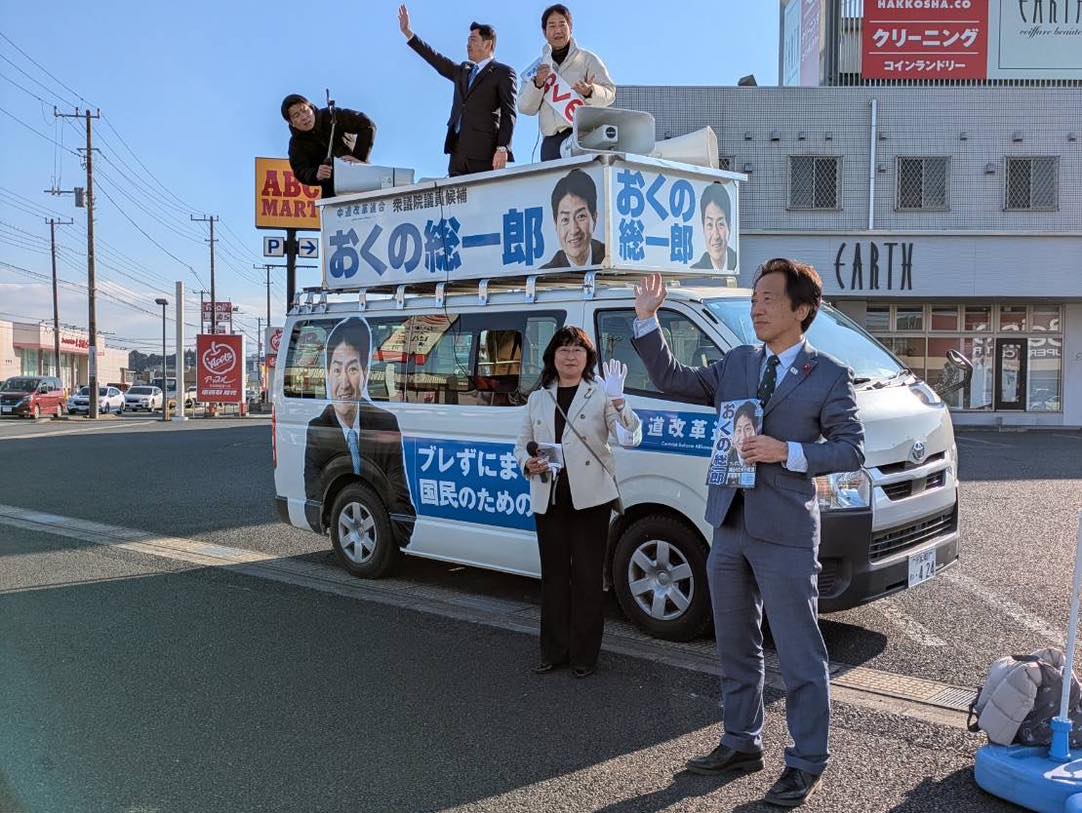 奥野候補者を支える同志と政策チラシを配りながら、ご支持を訴え、20時に終えました。