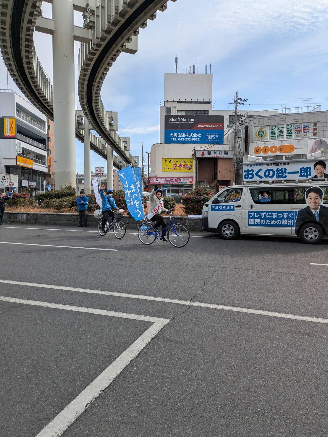 街頭演説会終了後、おくの候補は自転車に乗って市内遊説へ出発。
