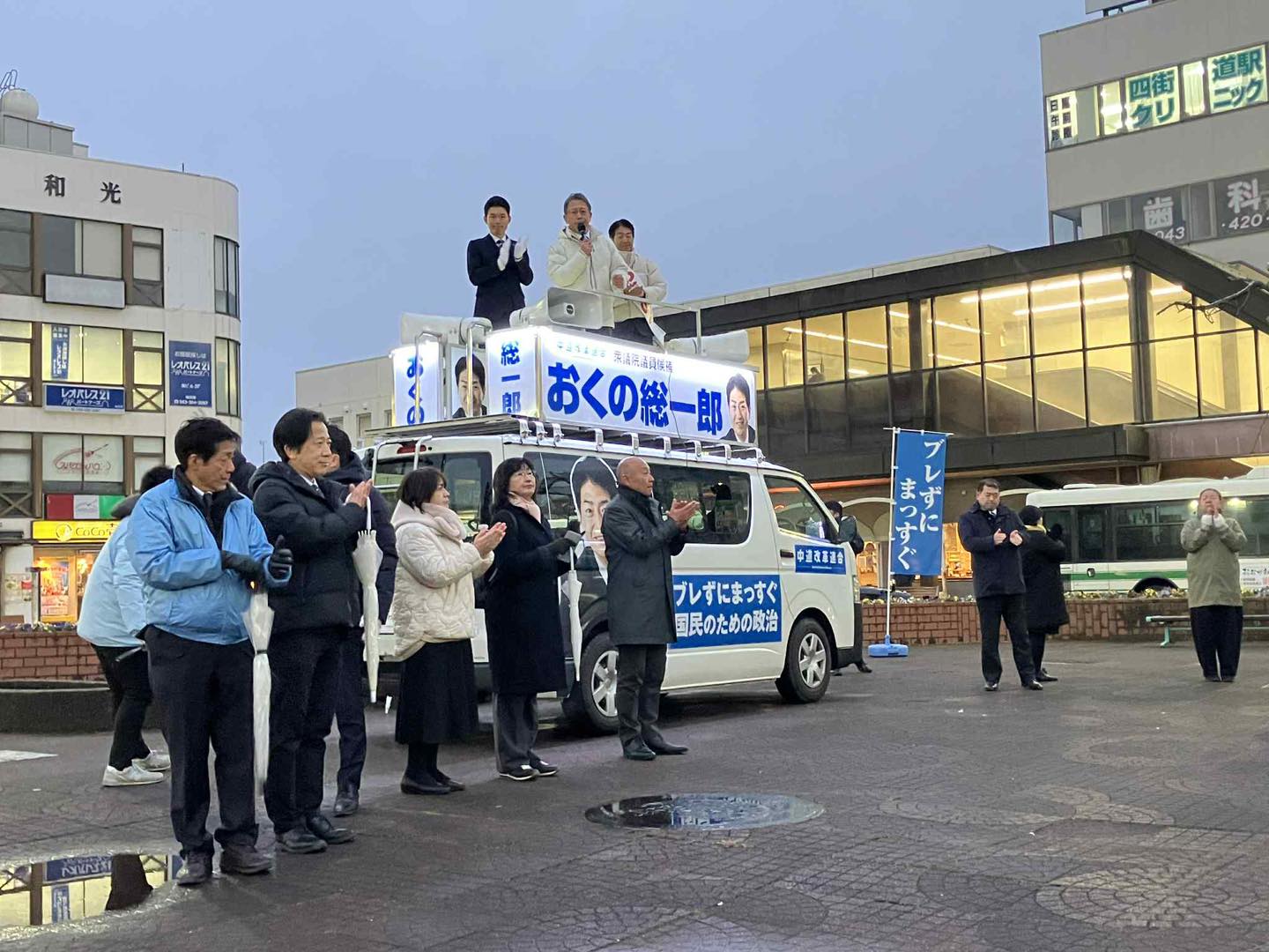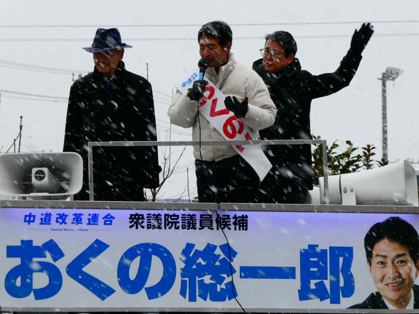 高市総理による大義なき解散総選挙により、おくの候補は立憲民主党を離党し、急きょ立ち上がった新党「中道改革連合」に結集しました。