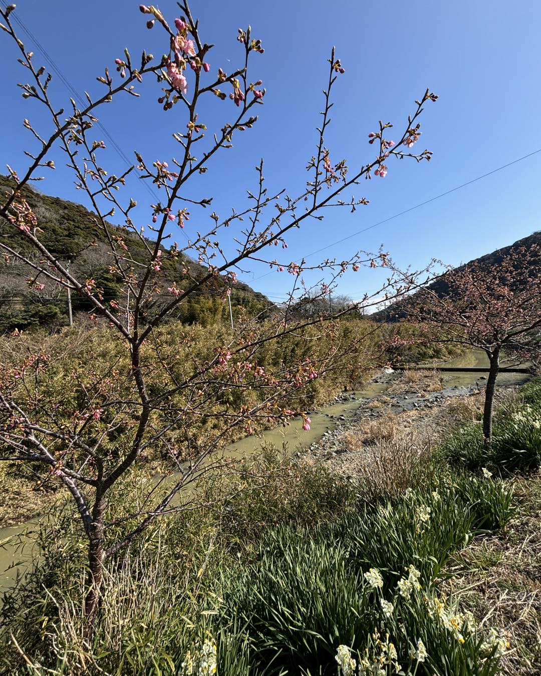 画像は、鋸南町・保田川沿いの頼朝桜と水仙。