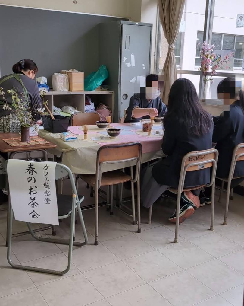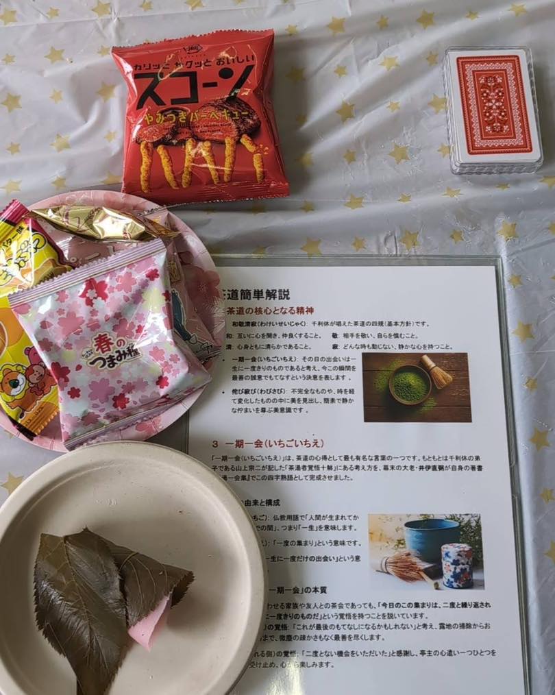 生徒さんは、地元の和菓子店の桜餅やお菓子を食べながら、友だちや地域の方々とのおしゃべりやトランプなどに興じていました。